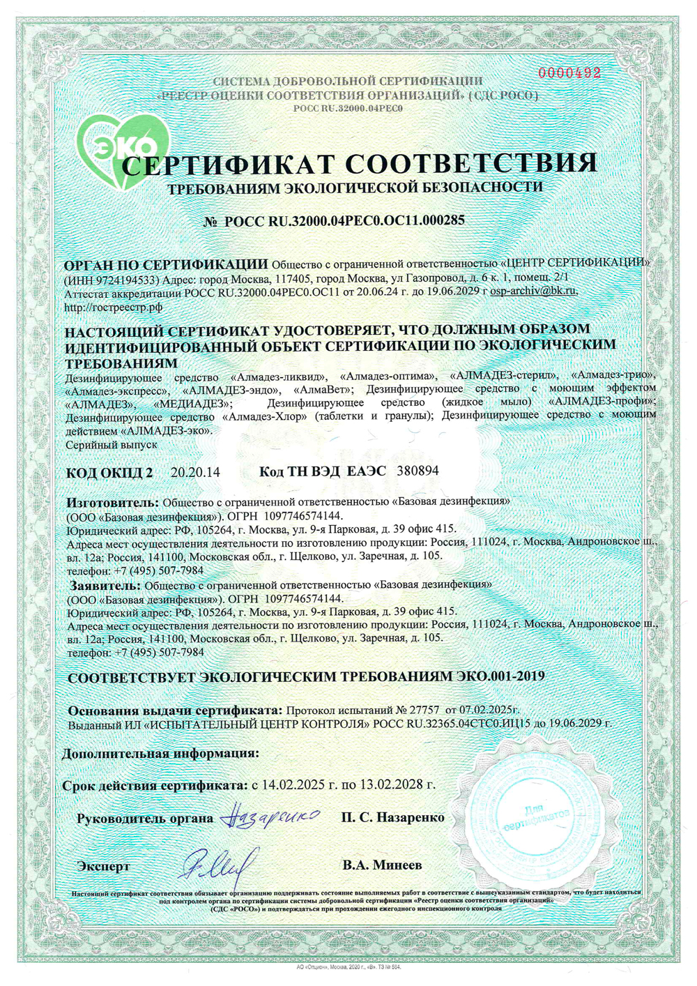 ООО «Базовая дезинфекция» подтверждает свою приверженность высоким стандартам — наша продукция надёжна, безопасна и экологически ответственна.