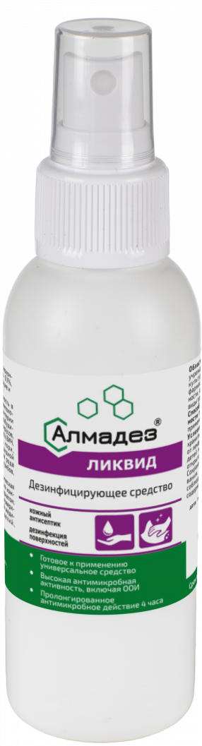 - Может использоваться для пропитывания на месте сухих салфеток, помещенных в Диспенсерную систему «Алмадез», и дальнейшего применения их для очистки и дезинфекции поверхностей методом протирания согласно утверждённой инструкции по применению.